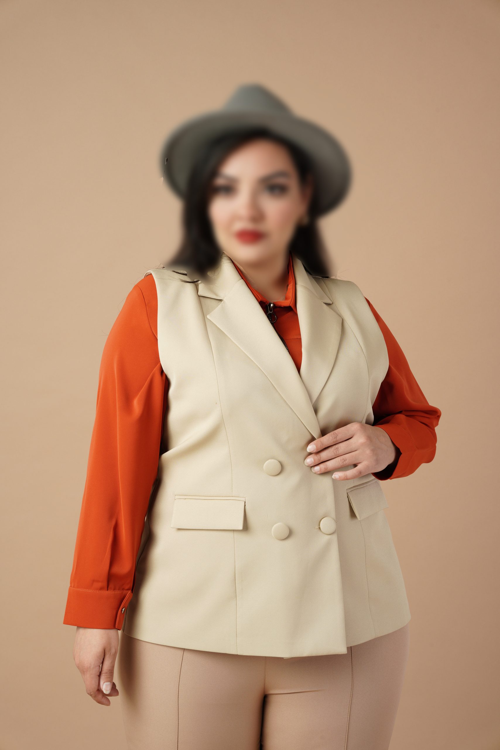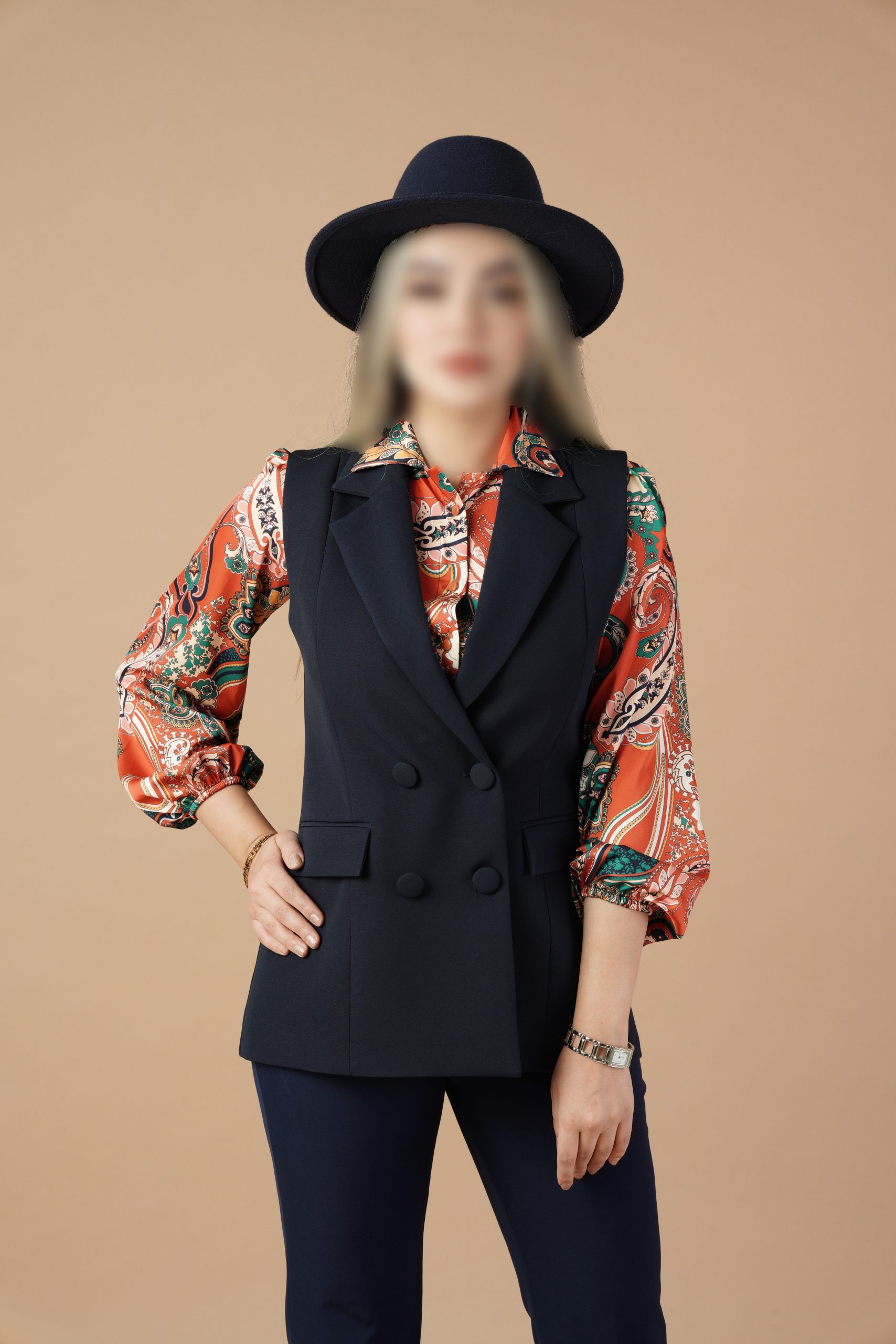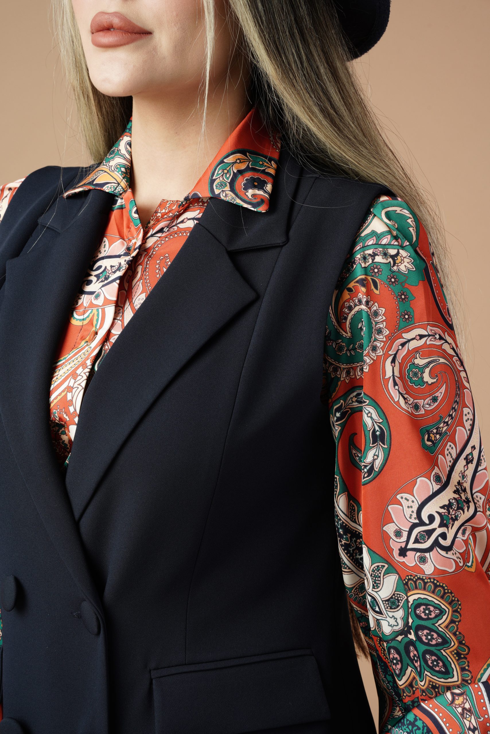 وست یک ایتم فوق العاده کاربردی و شیک است که با هر ایتم دیگری استایل میشه.طراحی دبل برست {دو ردیف دکمه}این وست یک جلوه رسمی و در عین حال مدرن به ان داده است . این نوع طراحی به خصوص در افراد پلاس سایز میتواند با ایجاد خطوط عمودی اندام را کشیده تر نشان میدهد.یقه برگردان ان هم به زیبایی روی سینه قرار گرفته .با هرنوع شومیز و شلواری استایل میشه .