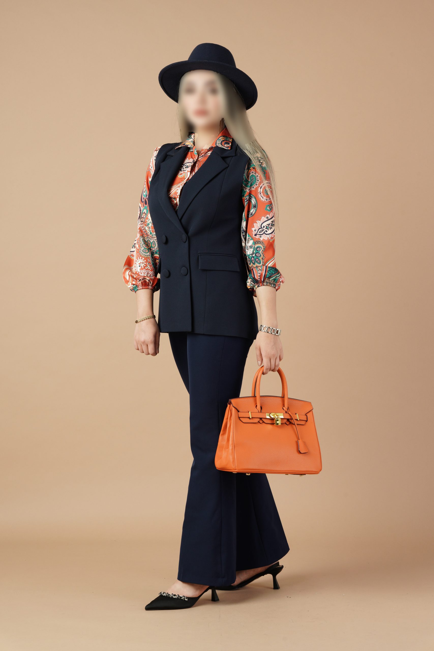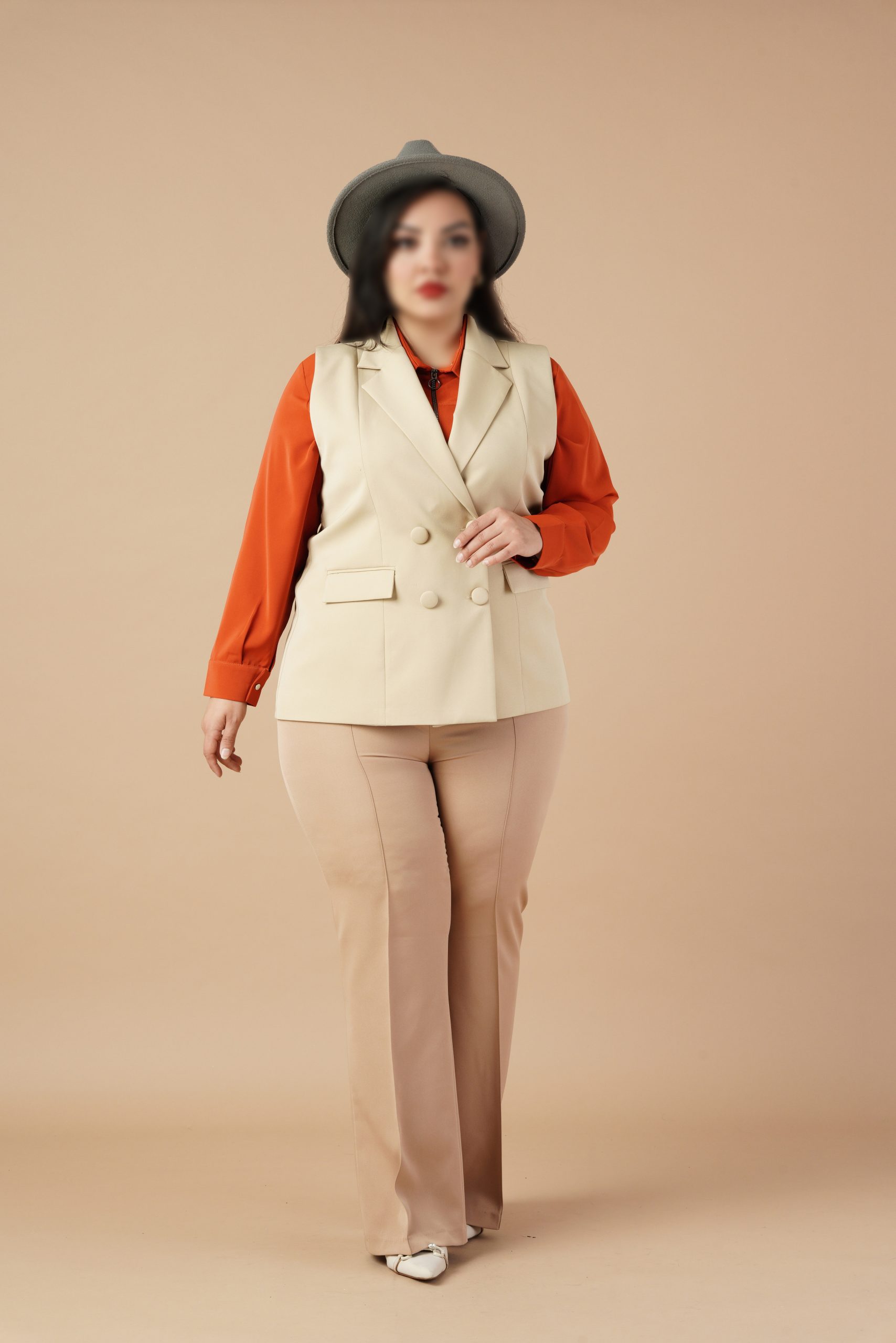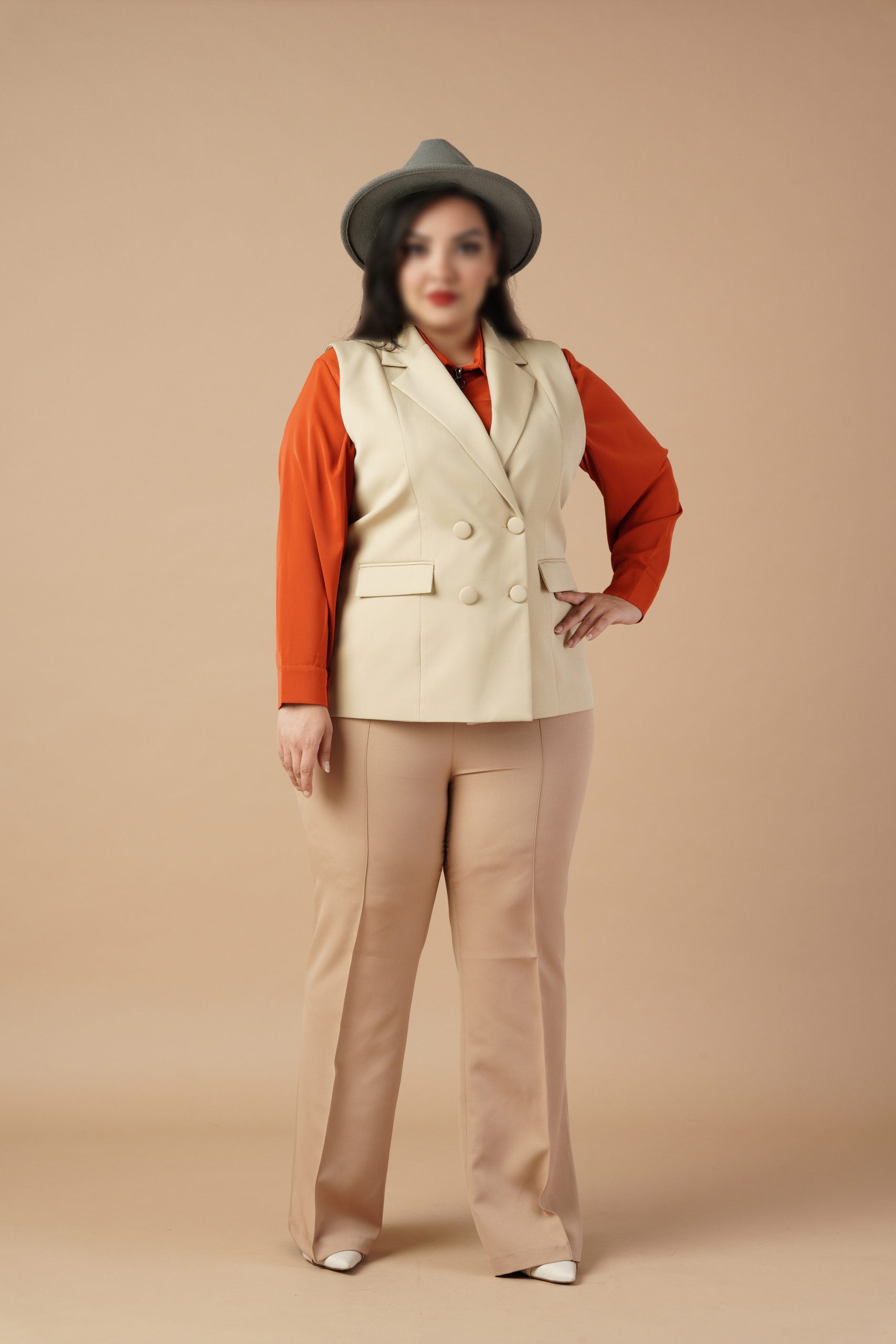 وست یک ایتم فوق العاده کاربردی و شیک است که با هر ایتم دیگری استایل میشه.طراحی دبل برست {دو ردیف دکمه}این وست یک جلوه رسمی و در عین حال مدرن به ان داده است . این نوع طراحی به خصوص در افراد پلاس سایز میتواند با ایجاد خطوط عمودی اندام را کشیده تر نشان میدهد.یقه برگردان ان هم به زیبایی روی سینه قرار گرفته .با هرنوع شومیز و شلواری استایل میشه .