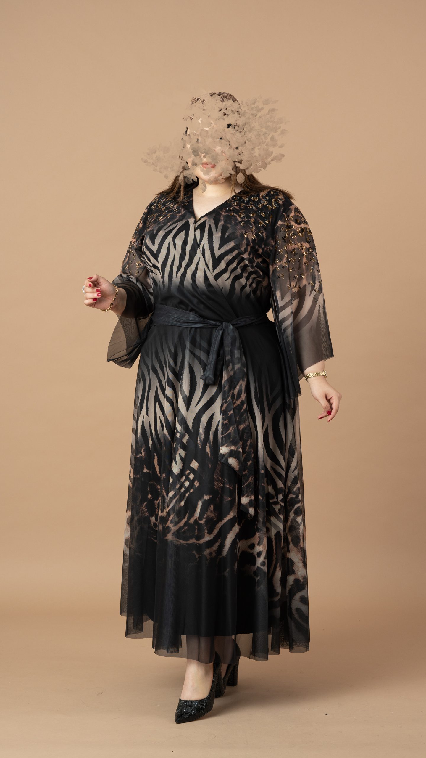 این پیراهن پلاسسایز با طراحی جسورانه و چشمگیر، ترکیبی از الگوهای حیوانی مانند راهراههای گورخری و خالخالهای پلنگی در طیف رنگهای مشکی، خاکستری و قهوهای است. جزئیات آن بهگونهای طراحی شدهاند که هم فرم بدن را متعادل نشان دهند و هم حس قدرت و اعتماد به نفس را منتقل کنند.
