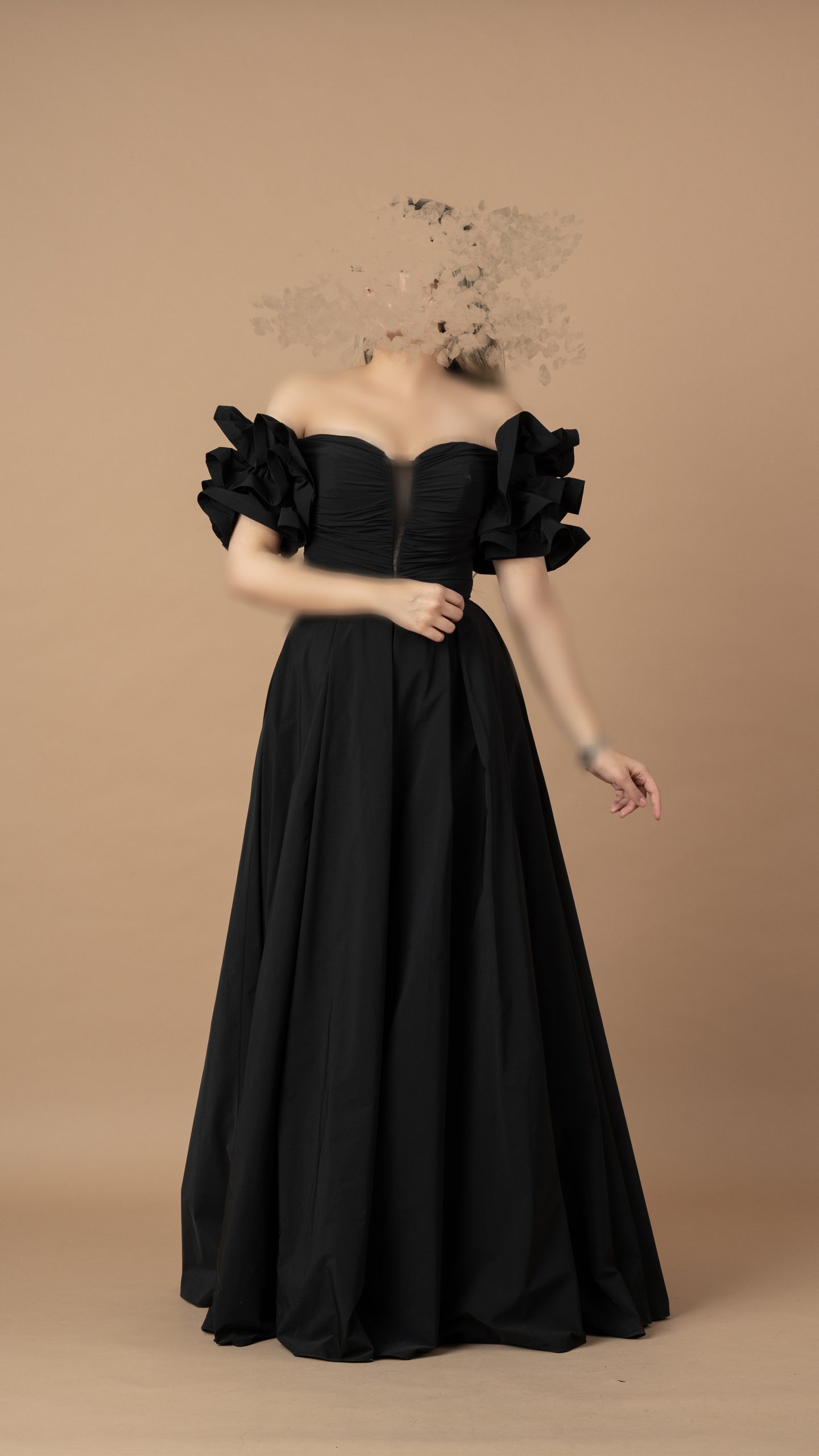 از برجسته ترین جزییات استین های کوتاه و پف دار هستند که به صورت لایه ای و چین دار روی بازو ها قرار گرفته اند و جلوه ای دراماتیک به لباس داده اند .تور کارشده در قسمت سینه جزییات ظریف و مدرن به ان افزوده است .