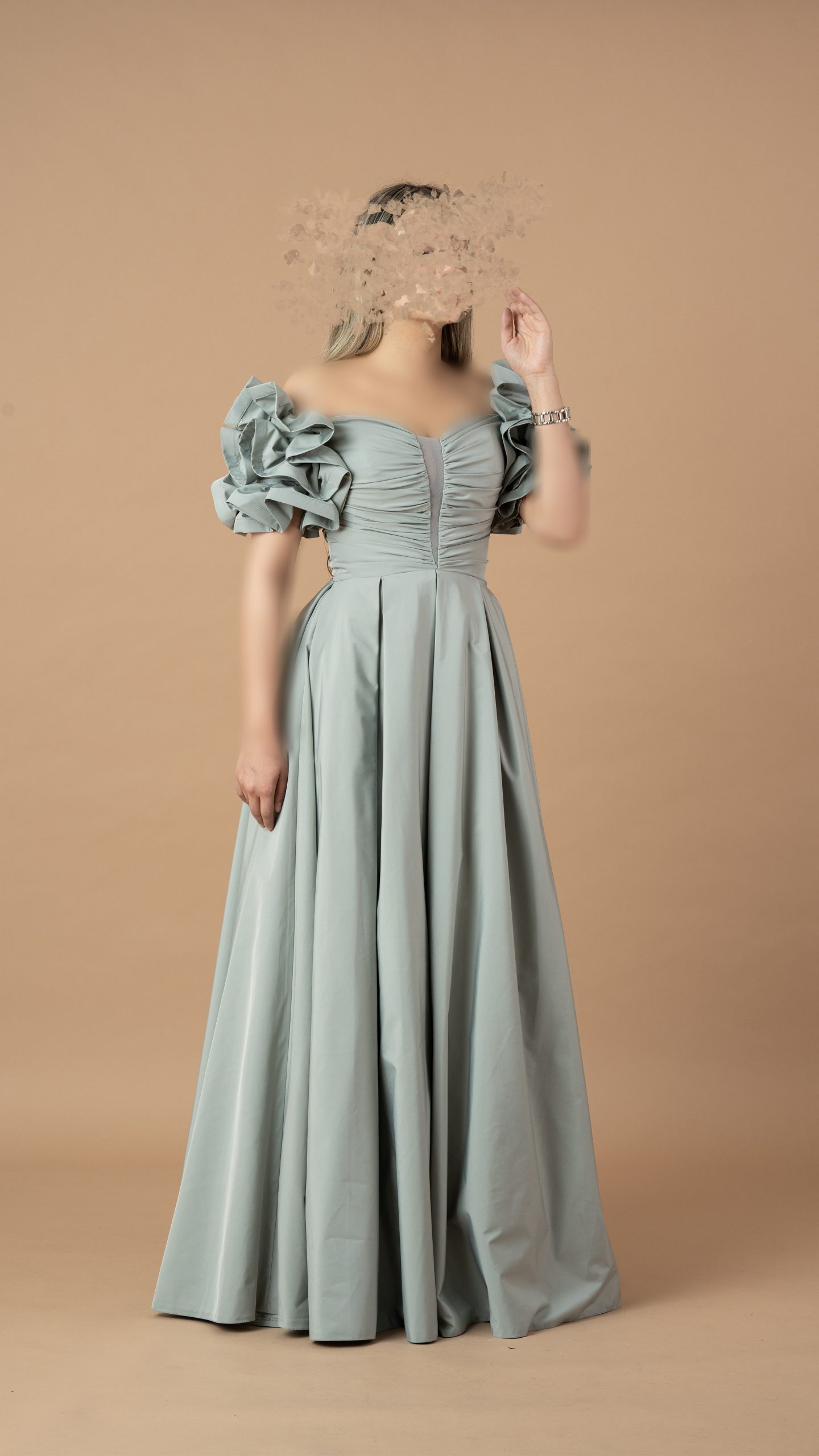 این پیراهن عروسکی یک لباس شب مجلسی {ballgown}با جزییات چشم گیر است . مدل دکلته {off_the_sholder} با یقه شیرین به ان زیبایی بخشیده /دامن ان بسیار پُرچین و حجیم و بلند است که فرم کلاسیک یک لباس شب مجلسی را ایجاد کرده است.