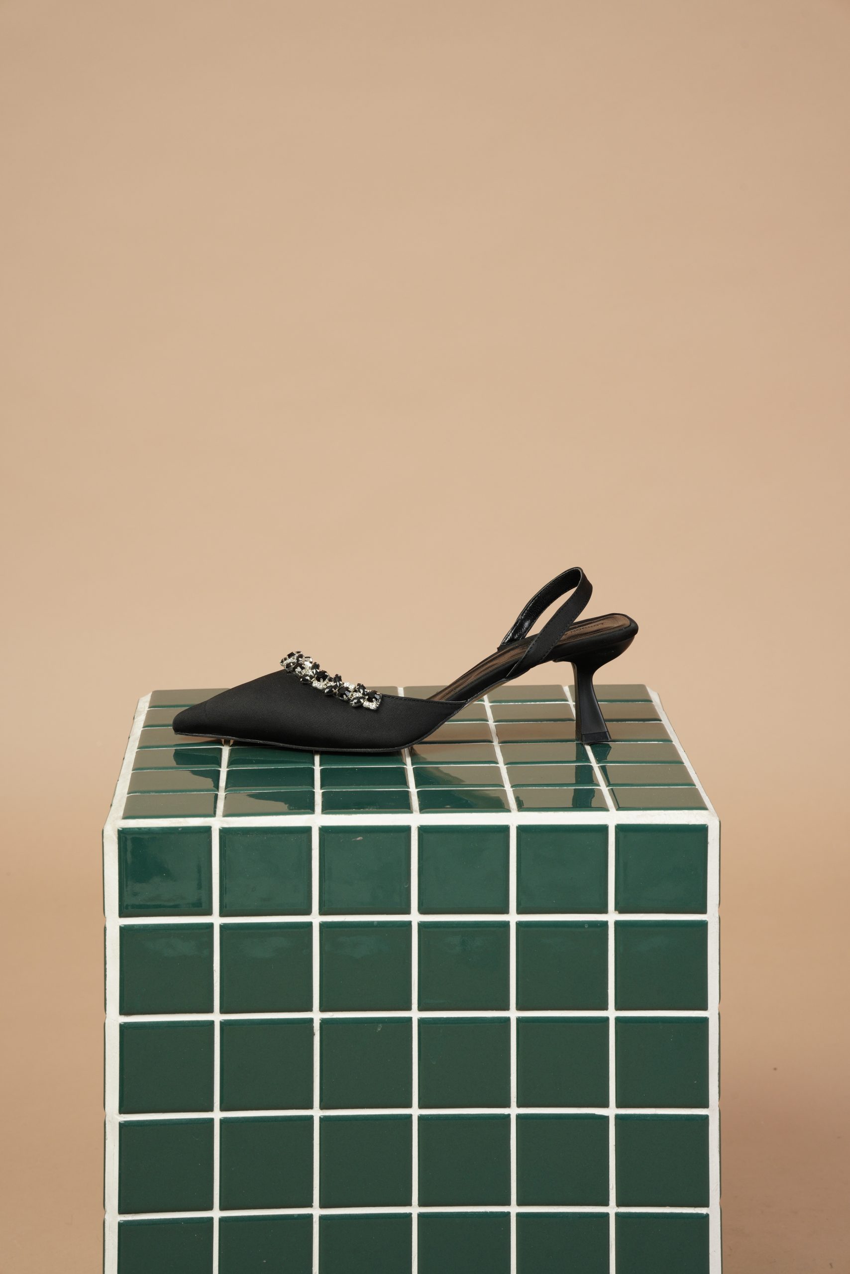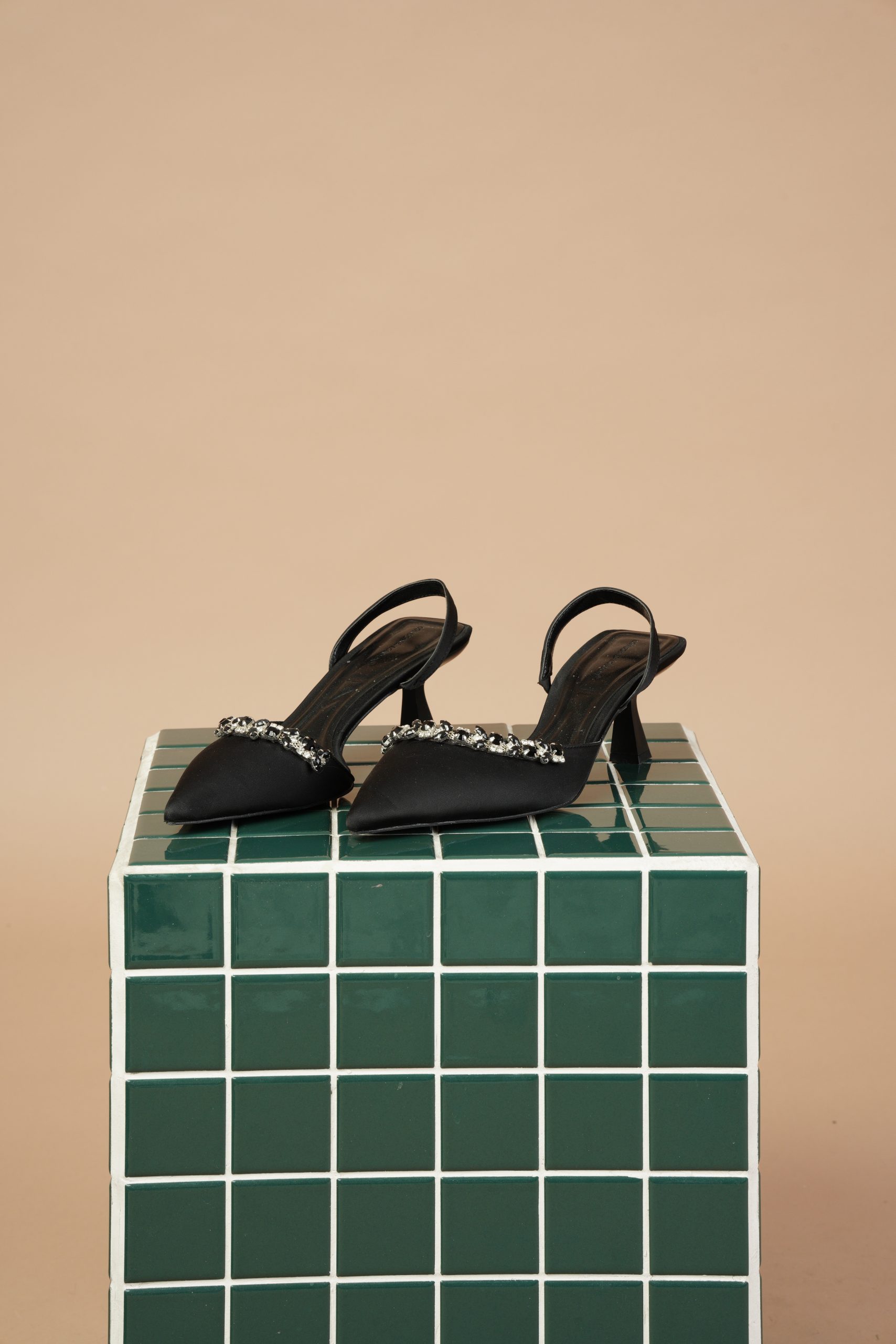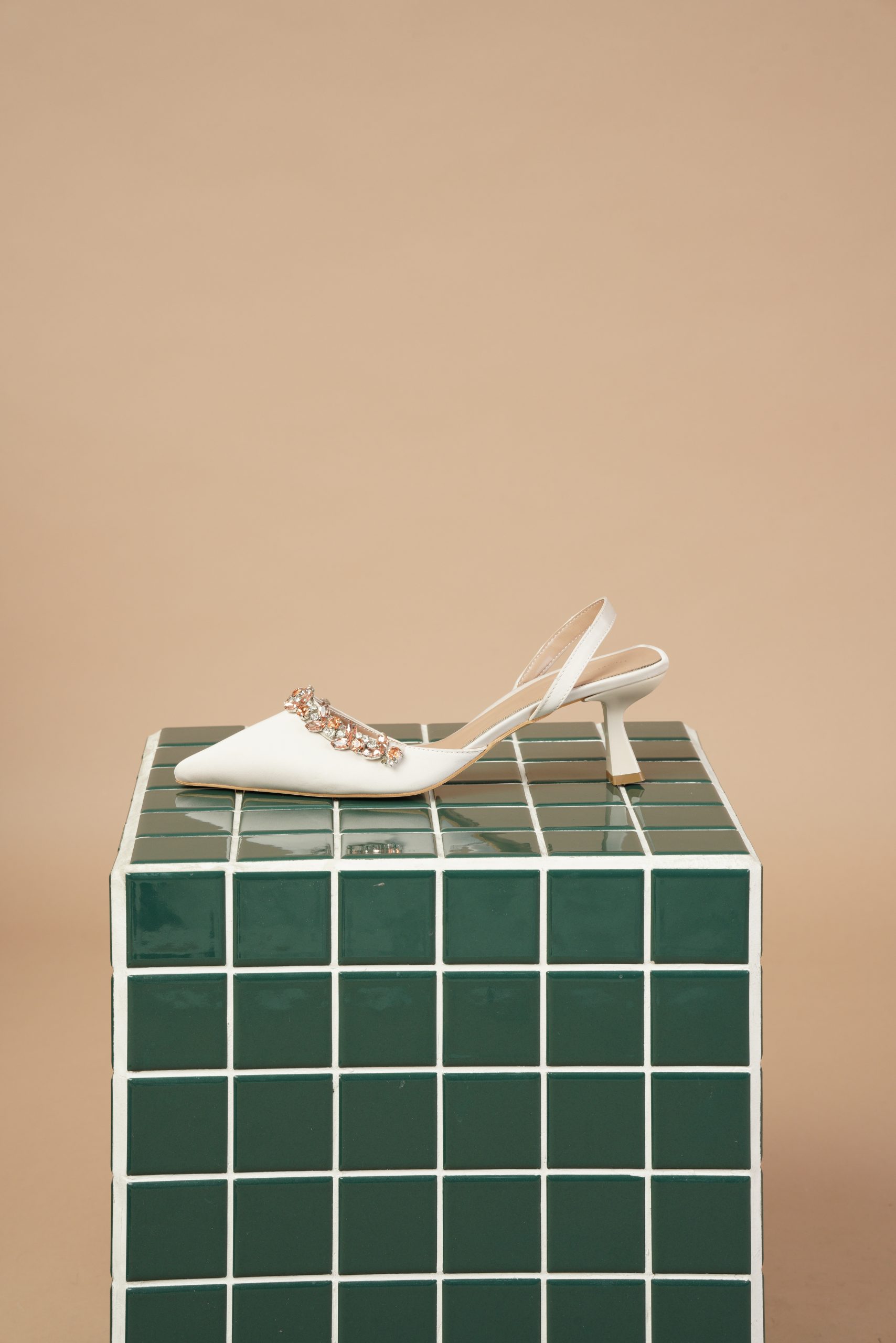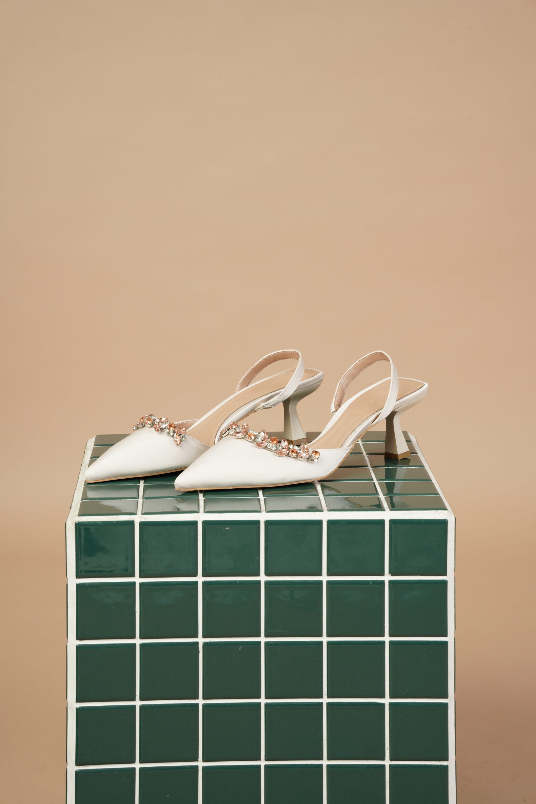 این کفش پشتباز سفید با پاشنهی ظریف و نگینهای زینتی، نمونهای خیرهکننده از طراحی زنانهایست که هم لطافت دارد و هم جلوهای باشکوه.
