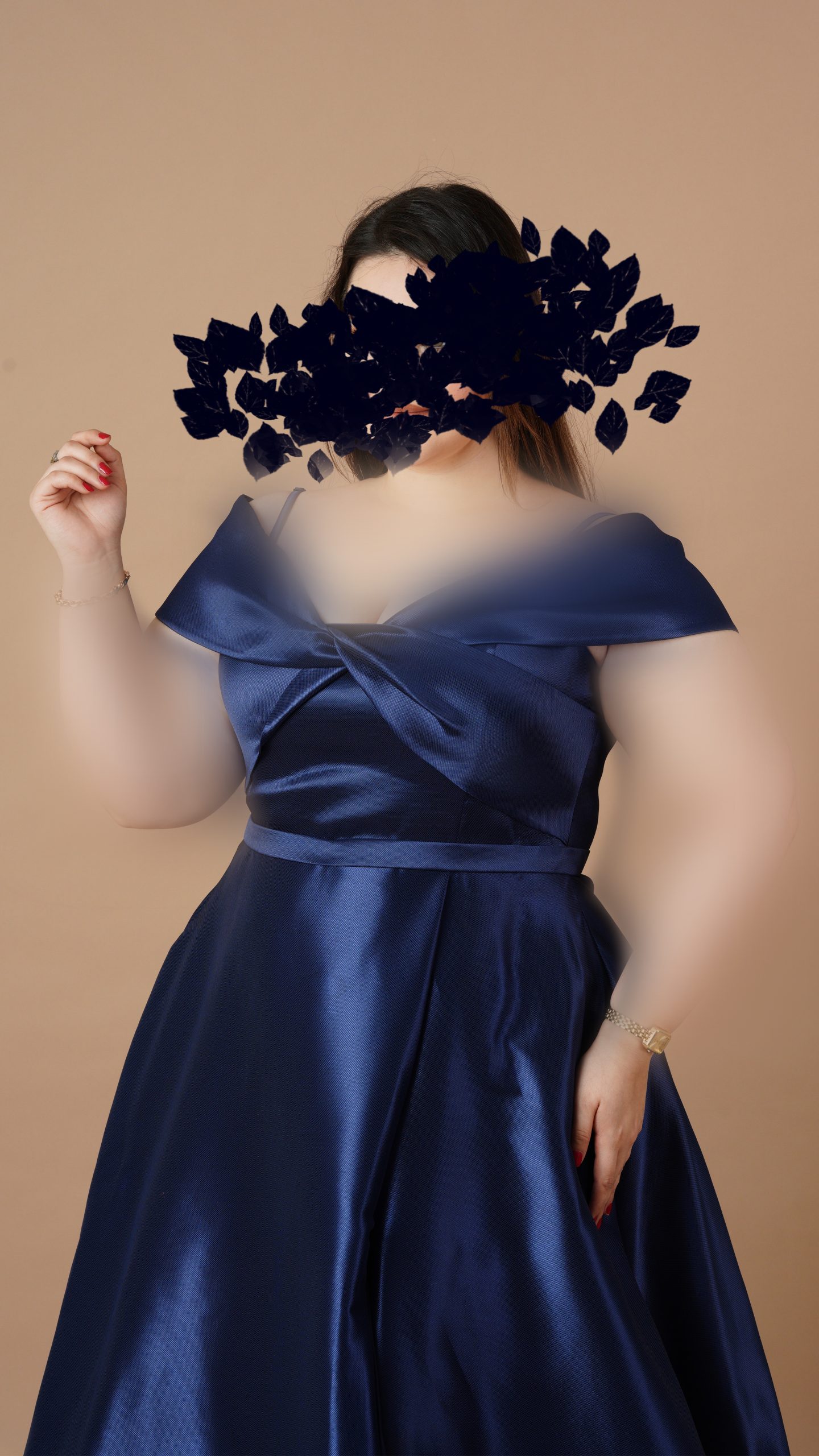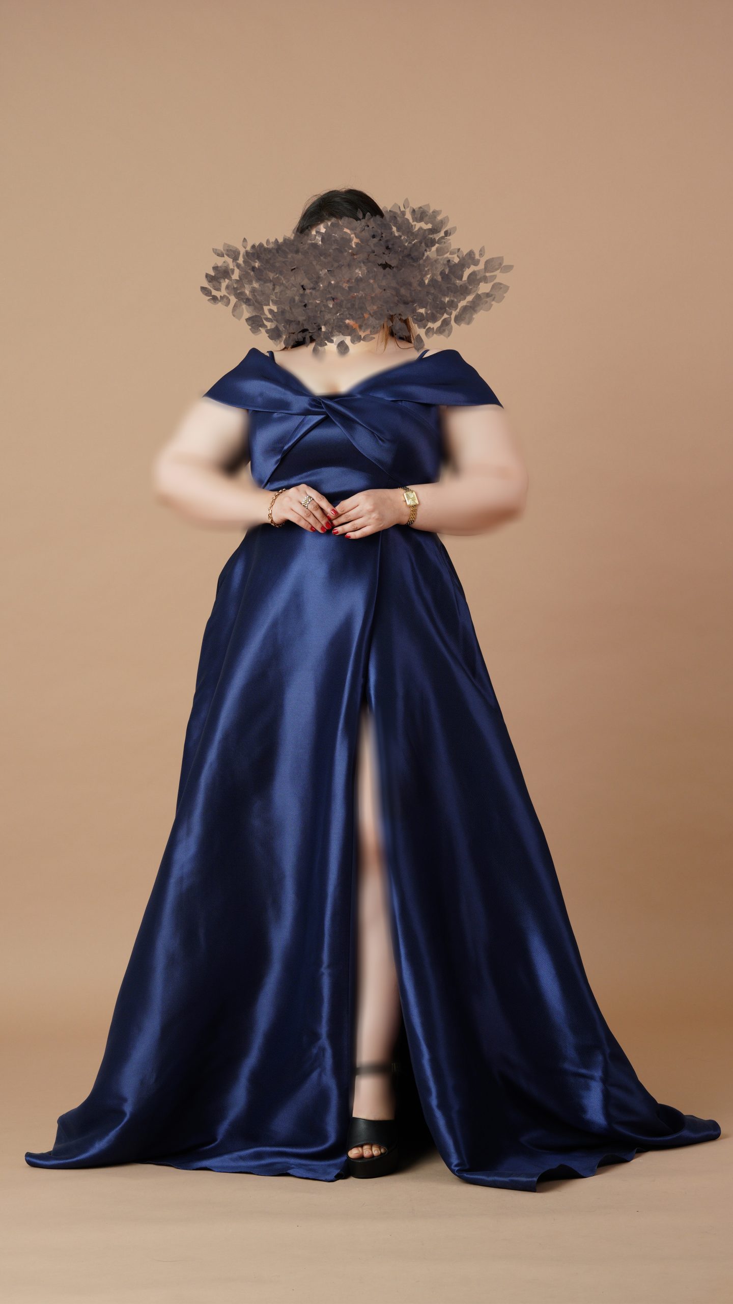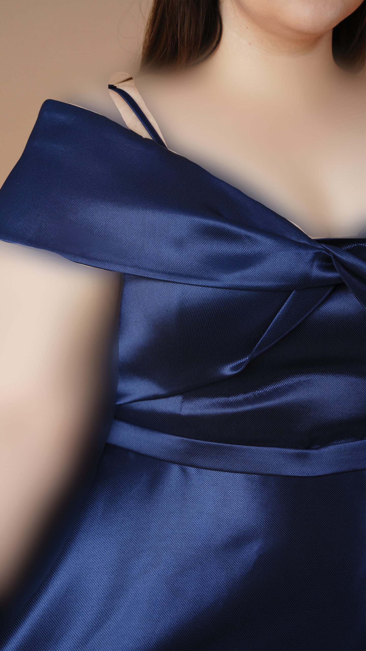 - جنس ساتن: پارچهای براق و روان که با هر حرکت، نور را منعکس میکند و جلوهای سلطنتی به لباس میدهد. رنگ سرمهای آن، حس اعتماد به نفس و وقار را منتقل میکند.